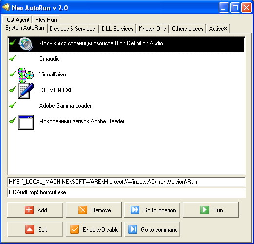 Для того, чтобы каждый раз вручную не просматривать все эти ключи на наличие в них вредных программ и модулей, я использую плагин Neo_autorun от программы Neo Tweaker . Это экономит время и работать намного удобнее, чем с редактором реестра. Для редактирования и удаления ненужных программ достаточно запустить плагин и на вкладке System Autorun выбрать ярлык с программой и нажать кнопку Remove. Существует несколько программ аналогичных , например утилита Starter. |